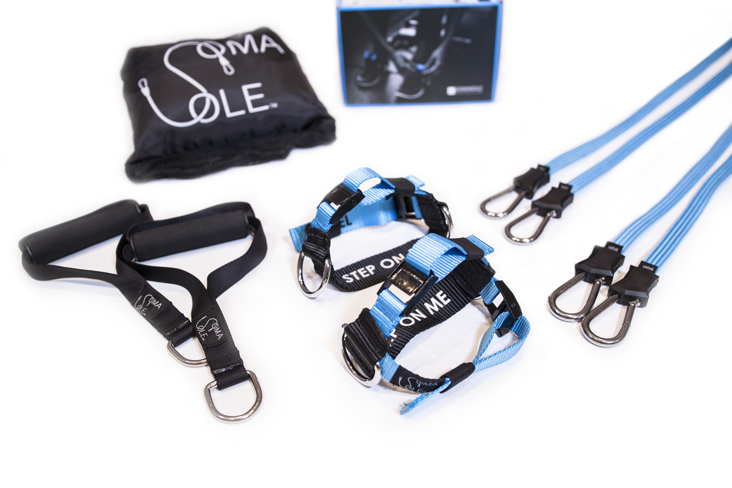 足部にSOMASOLEを取り付け、専用のレジスタンスリンクと専用ハンドルを装着するだけで、安全にどのような場所でも効果的なファンクショナルトレーニングが可能です。 SOMASOLEのトレーニング対象は、ストレングストレーニング等のフィットネストレーニングにとどまらず、リハビリテーショントレーニングやケガの予防のトレーニングまで幅広く、どの年齢層の方にも安心してお使いいただけます。